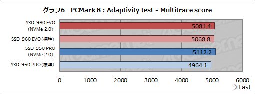 グラフ6は10回のワークロードにおけるスコアの平均値をまとめたものだ。スコアはいずれも5000前後で,それほど大きなスコア差は見られない。ただ,SSD 950 PROのNVMe Driver 2.0使用時と標準ドライバ使用時に,3%ほどのスコア差がついているのが目に付く。