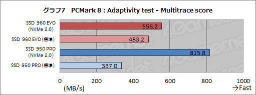 CrystalDiskMarkでは,SSD 960 EVOがSSD 950 PROを上回る性能を見せており,NVMe Driver 2.0の効果もやや高めという結果となったが,「PCMark 8」の「Expanded Storage」ではどうなるだろうか。