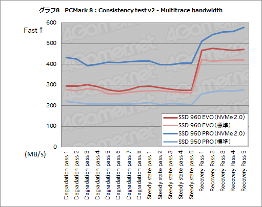 最も高性能を記録したのは,SSD 950 PROのNVMe Driver 2.0使用時で,Steady pass 5まで400MB/s前後という,高い平均ストレージ帯域幅を記録した。ところが,標準ドライバ時のSSD 950 PROは最もスコアが低く,Steady pass 5まで200MB/s強という低いスコアまで落ち込んでいる。Recovery passでの回復も鈍い。