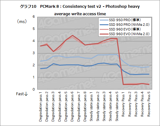 つまり,劣化から解放されたあとの平均書き込みアクセス時間は,SSD 950 PROよりもSSD 960 EVOのほうが優れているということになる。