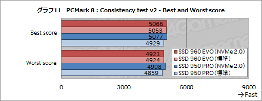 Consistency testの最後に,18回分のスコアから,最良のスコア(Best score)と最悪のスコア(Worst score)を抜き出したグラフ11を作ってみた。Best scoreとWorst scoreの差が小さいほど,高負荷時の性能低下が少ない安定したSSDということになる。