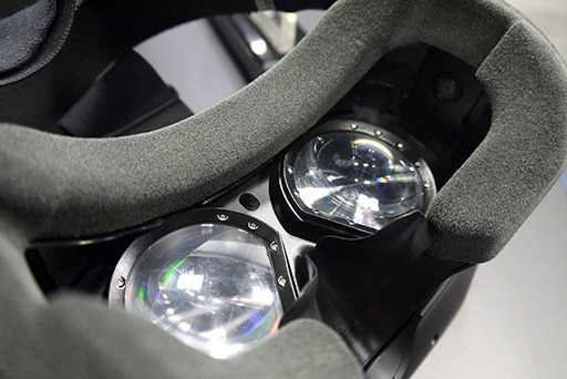 デモに使っていたViveは,外観は市販のものと変わらない。違いは内側にあり,映像を覗き込むレンズの周囲に,赤外線を発するLEDが取り付けられていた。このLEDが発した赤外光は,装着者の瞳孔に反射するので,その反射光をHMD内部に組み込んだ赤外線センサーで捉えるという仕組みである。