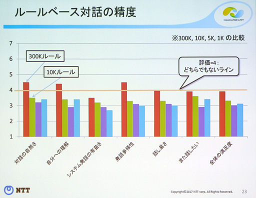 グラフを見ると30万ルールが良い成績になっているが,「実は,15万ルールでも試しているが,30万ルールとスコアは大して変わらなかった」と東中氏。ユーザーの発話すべてを予測してルールを作ることができない以上,ルールの数を増やし続けても会話の精度が直線的に上がっていくわけではないというわけである。これはとても重要なポイントだと東中氏は強調していた。
