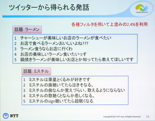Twitterはノイズが多い問題点を抱えるが,NTTではさまざまなフィルタを駆使して「質のいい“上澄み”の2.4%を採用している」(東中氏)とのこと。これにより,会話の精度を向上させることができているそうだ。