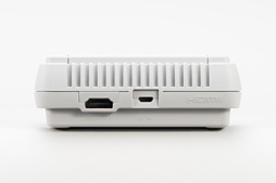 本体のほうは,もう,見事にミニチュア版スーパーファミコンである。カセットのスロットとカセットを取り出すためのスイッチがダミーというのはミニファミコンと変わらず。背面のインタフェースが給電用のUSB Micro-Bとビデオ出力用のHDMI Type Aというのもミニファミコンと同じだ。