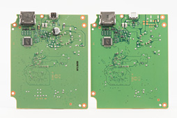 ミニスーファミとミニファミコンのメイン基板を並べたカット。いずれの写真も左がミニスーファミのものだ。表面の違いは基板型番の刻印くらいだが,背面側を見ると,電源周りに手が入っているのが分かる。HDMI出力のところにヒューズっぽいものが追加となっているのも見てとれるだろう