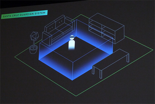 今回,Santa Cruzのデモに使われたスペースは,おおよそ8×4mほどの広さがあった。これだけのスペースを確保できる家庭がどれほどあるのかは分からないが,それだけ広いルームスケールのVRコンテンツでも,Santa Cruzは動かせますよ,ということを示したかったのだろう。