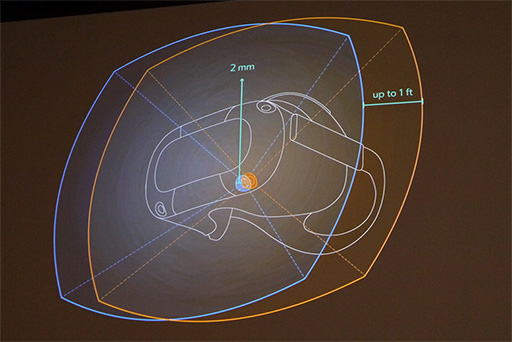 Santa Cruzの専用モーションコントローラは,Rift用のモーションコントローラ「Touch」で拳を包み込んでいた赤外線LED内蔵のリングを,上部に配置換えしたような形状となっている。この配置によって,ゴーグル側のカメラでLEDの位置を捉えやすくしたようだ。