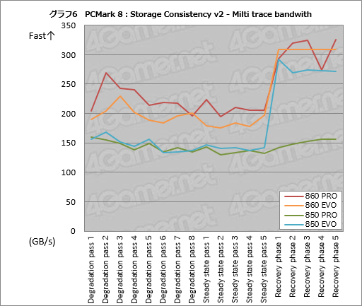 というわけで,Consistency test v2の結果を見ていくことにしよう。グラフ6は,Consistency test v2におけるStorage testの平均帯域幅変化をプロットしたものだ。一般的には,Degradation passで性能が徐々に低下していき,Steady state passで最も低くなり,Recovery phaseに入ると性能が徐々に回復するというパターンを示すが,SSD 850シリーズと比べると,SSD 860シリーズではDegradation passからSteady state passに至る平均帯域幅の低下が抑えられているのが分かる。