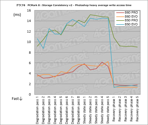 860 EVOは,Degradation pass 8でのみ0.43msを記録するものの,850 EVOと比べると安定感が増しており,またアクセス時間も短くなっている。