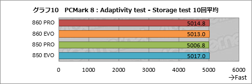 一方のAdaptivity testでは,上のRecovery phaseに相当するテストを10回繰り返し,ストレージにとっての性能を発揮しやすい環境におけるPCMark 8のストレージテスト結果を求めるものになっている。