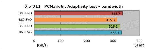最後にAdaptivity testの結果もまとめておこう。グラフ10はAdaptivity testで実行されたStorage test合計10回のスコア平均を,グラフ11は平均帯域幅をそれぞれまとめたものだ。どちらも「良好な環境でPCMark 8のStorage testを実行するとこの程度のスコアが出る」という目安になる。