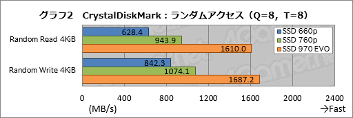 続いてグラフ2はQD=8,T=8という条件で実行したランダムアクセスの結果をまとめたものだ。「マルチスレッド環境におけるランダムアクセス性能を見るテスト」として,CrystalDiskMarkのバージョン6世代で新設となったテストの結果となる。