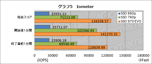 まずは総合スコアからだが,SSD 660pは比較対象に遠く及ばない。SSD 760p比で約34%,SSD 970 EVO比で約19%だ。よってSSD 660pは,データベース処理のような,ストレージI/Oが主体となるようなアプリケーション用途では選ぶべき製品ではないと断言できるだろう。