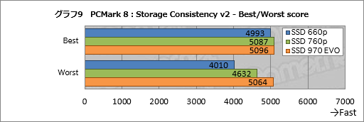 ちなみに,SSD 760pは同91%とまずまず,SSD 970 EVOはBest scoreとWorst scoreがほぼ横並びとなっており,非常に優秀だと言える。