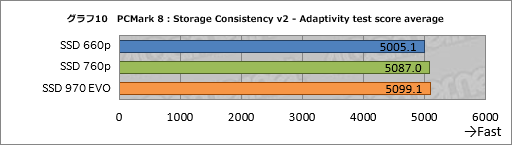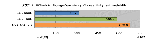 PCMark 8のAdaptivity testもまたストレージにとって非常に“重い”テストだが,ストレージに大きな負荷がかかる状況においてSSD 660pはNVMe対応らしからぬ性能しか発揮できないということは,この結果から明らかだろうと思う。
