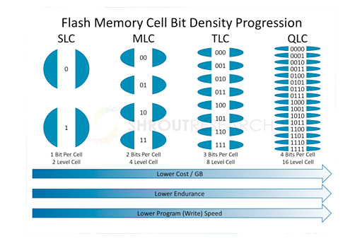 かつてはメモリセルあたり1個のビット情報を記録するSLC(Single Level Cell)採用モデルもあったが,今日(こんにち)では企業向けのごく一部に採用例があるのみで,一般向けはほぼ存在しない。NAND型フラッシュメモリはセルあたりに記憶するビット数が少ないほど耐久性や書き込み速度が高くなるのだが,コストが高くつき,またそれゆえに大容量を実現しづらくなる。