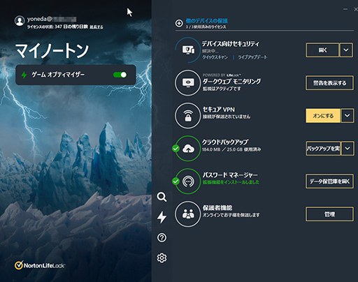 ノートン 360 for Gamersはおおむね,ノートン 360 デラックス相当の機能を備えている。これらは,とくにゲーマー向けというわけではないが,便利な機能を簡単に紹介しておこう。