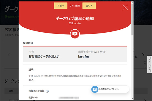 - ダークウェブ モニタリング:監視対象の個人情報をダークウェブで見つけたら通知する