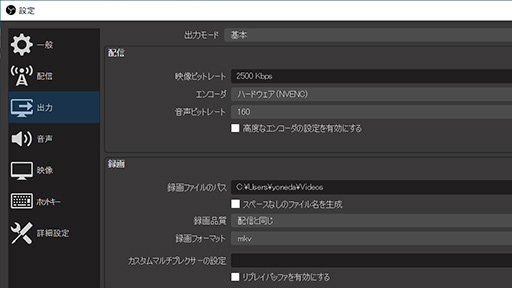 録画のテストには,OBS(version 27.0.1)を用いる。録画の画質はデフォルトの設定を利用した。