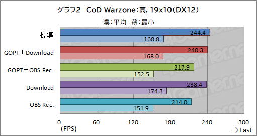 ダウンロード中は,ゲームオプティマイザーオンで平均2fpsの向上と微妙な程度だが,OBSによる録画はゲームオプティマイザーで平均4fps近い向上が得られた。Watch Dogs Legionにおけるダウンロード時ほどではないが,効果が見られたと考えていいだろう。