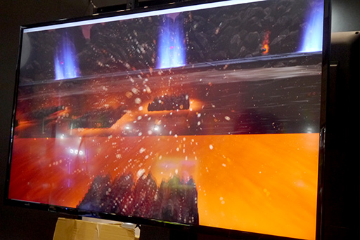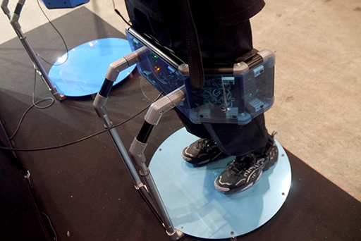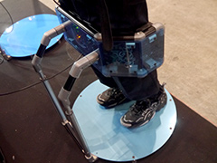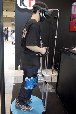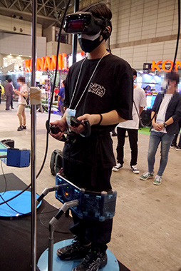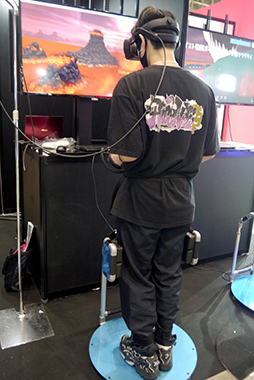 デモンストレーションで体験できる専用ゲームは,「煮えたぎる溶岩の上に渡された,岩の橋を歩いて渡る」というもので,橋の細い部分を渡るときなどは,思わず緊張してしまった。ハーネスや専用シューズの着脱が必要なく,スタンドの上に乗って「凹」の字に足を入れるだけという手軽さも,魅力に感じられた。