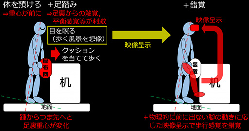 足踏みのときに「進行方向に体重をかける」のがポイントで,この動きに移動しているゲーム画面が組み合わさると,自分で足踏みしていることもあって,実際に歩行しているような感覚を味わえた。