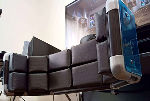 こうした中で,簡便さと省スペース性,そして低価格を謳うのがCrusである。開発者である脇田 航氏の,「机の前にクッションを当てて目をつむり,歩く風景を思い浮かべながら前に進もうと足踏みすると歩行感覚に近い感覚が得られた」という実体験をもとに作られたデバイスで,「机の前に当てたクッション」に当たる機器が本体である。