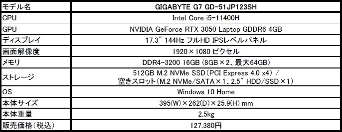 GIGABYTEからRTX 3050搭載で約13万円の17.3型ゲームノートPCが登場