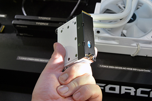 そして,Team Groupが本命とするのが,M.2 SSD向けの簡易液冷装置だ。仕組みはCPU向けに普及している簡易液冷のオールインワンクーラーと同じで,SSDに貼り付ける液冷ヘッダと,冷媒を循環させるポンプおよびラジエータ,そしてラジエータを冷却するケースファンで構成される。