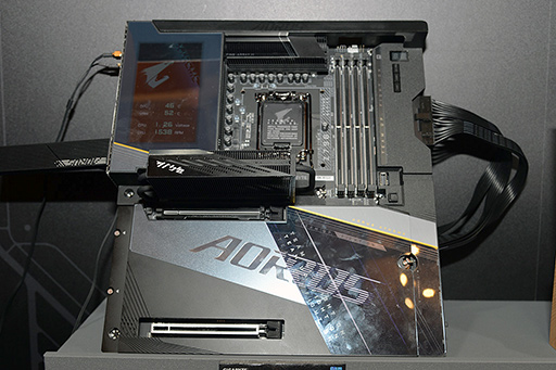 GIGABYTEは展示会場近くのプライベートブースで,2種類のPCIe 5.0 x4マザーボードを披露していた。先述したとおり,2023秋以降の発売を予定しており,展示はライティングのための通電のみで非可動デモとなっている。いずれも,ヒートシンクの取り付けにネジやドライバーが不要な簡易着脱方式を採用している。