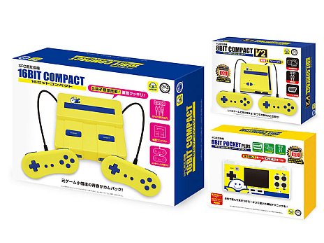 ファミコン互換機は,TVに接続して使用する「8ビットコンパクトV2」と,携帯ゲーム機型で外でも楽しめる「8ビットポケットプラス」の2種類。スーパーファミコン互換機は,TV接続型「16ビットコンパクト」の1種類だ。