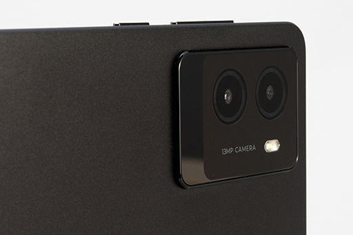 背面を見ると,右上(前面側からだと左上)に二眼式のアウトカメラが目を惹く。背面パネルから,アウトカメラユニットが1mm少々突出している構造は,LAVIE Tab T9とそっくりだ。