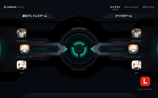 Legion Spaceは,タブレットにインストールしたゲームを管理するランチャー機能と,CPUおよびGPUの動作状態を確認したり,メインメモリやストレージを部分的に解放して,ゲームの動作を妨げないようにしたりする機能を備えている。