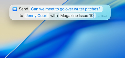 Spotlightで,ファイルを検索するだけではなく,ファイルやアプリの操作も行えるようになったのもポイントだ。新たに導入した「クイックキー」機能により,短いワードでアプリを操作できる。たとえば,Spotlightに「sm」と入力するとメッセージを送信できる(send message)という。