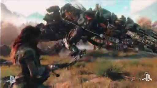 続いては,Guerrilla Gamesの新規タイトルの映像が紹介されています。三人称視点で描かれた自然あふれるフィールドで,機械仕掛けのモンスターを弓状の未来的な武器で攻撃しています。