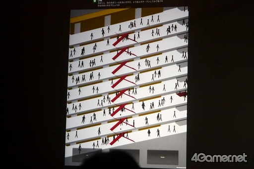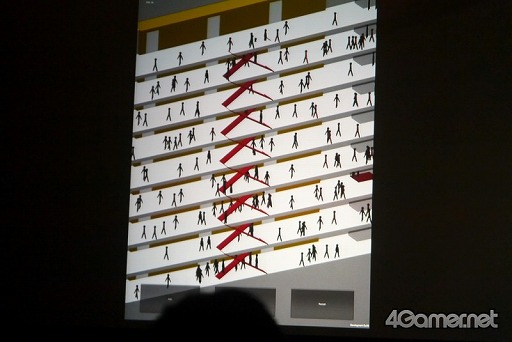 このプロトタイプを“リアル”にする方法があるが,それはグラフィックスを高度にすることではないのだという。氏が示した答えとはビルの中に,一人一人が独自の動きで行き交うたくさんの人々を表示すること。写真だと分かりづらいかも知れないが,グラフィックスが何か高度になっているわけではないのにとてもリアルに感じられた。ゲームにおいてリアル感を出すためにはどう表現すれば人がリアルに感じるのか,その方法自体も模索しなければならないというわけだ。