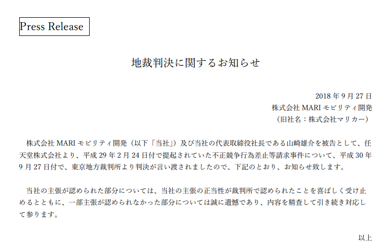 「マリカー」訴訟で東京地方裁判所が判決。任天堂の主張を認め,マリカーに対して損害賠償金の支払いなどを命じる