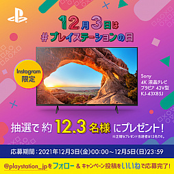 本キャンペーンの参加方法は、プレイステーション公式Instagramアカウント(https://www.instagram.com/playstation_jp )をフォローの上、キャンペーン投稿にいいねするだけです。ご参加いただいた方の中から抽選で、Sony 4K液晶テレビブラビア 43V型 KJ-43X85Jを、“プレイステーションの日”である12月3日にちなんで、12.3名様(正確なプレゼント当選者数は13名様)にプレゼントいたします。