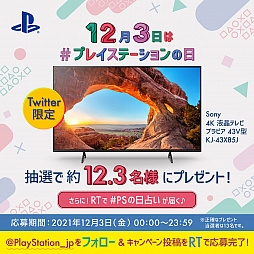 このキャンペーンでは,“プレイステーションの日”である12月3日にちなんで,Twitter,Instagramでそれぞれ12.3名(正確には13名)に,ソニー 4K液晶テレビ ブラビア 43V型 KJ-43X85Jがプレゼントされる。