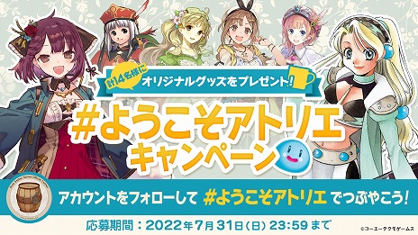 さらに、7月31日(日)まで「#ようこそアトリエ」キャンペーンも開催中です。「アトリエ」シリーズ公式 Twitter アカウント(@GustAtelierPR)をフォローの上、「アトリエ」シリーズやキャラクターたちの好きなところやプレイ感想などを「#ようこそアトリエ」をつけて、応募期間中にツイートした方の中から、オリジナルグッズをプレゼントいたします。