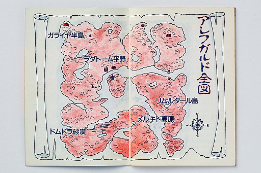 DQIの冒険の舞台であり,DQIIやDQIIIにも登場する「アレフガルド」。ゲーム中にマップ表示機能がないこともあり,取扱説明書には地図が掲載されているのだが,実はゲーム中に「アレフガルド」という地名は出てこない。これは,DQIのROMカートリッジの容量がわずか64KB(!)だったため,使用できるカタカナが20種類に制限され,「ア」と「フ」が使えなかったことに起因している。