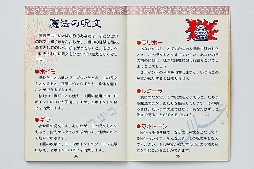 DQIの勇者は最終的に全10種類の呪文を習得するが,ゲーム内ではそれらの効果を確認できない。そのため,取扱説明書にすべての呪文の効果が掲載されており,ゲームをプレイしている最中に参照できるようになっている。それぞれの説明テキストもなかなか表現が凝っており,「指先から小さな火球が出て,怪物めがけて飛んでゆきます」といったように呪文を唱えたときの光景を思い浮かべられるよう工夫されている。