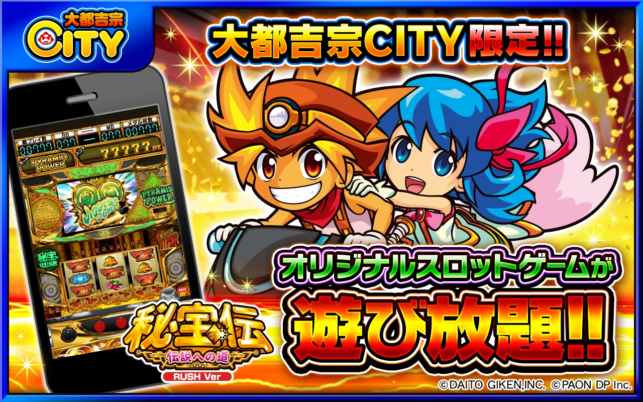 パチスロアプリ「秘宝伝(伝説)〜RUSH Ver〜」が大都吉宗CITYで配信開始