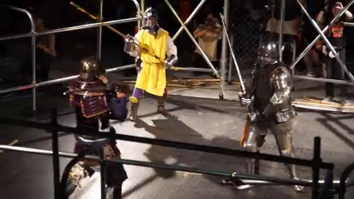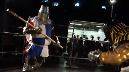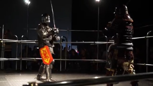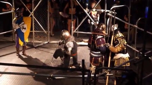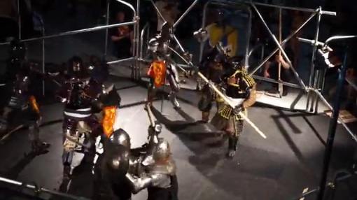 ![]() 加川選手と黒鋼衆・八ヶ代選手の激しい打ち合い。八ヶ代選手の鎧は新調したものではなく,本歌甲冑(レプリカではなく本物)をルールに合わせて改良したものだという |