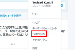 裾野を広げるポイントの1つめは,ハードルの低さだ。セルフサービス式広告を出すためにしなければならないことは,Webブラウザからのアクセスの場合,Twitterアカウントをクリックして表示されるメニューから「Twitter広告」を選択し,必要事項に答えることだけ。当然,一個人でも利用できる。