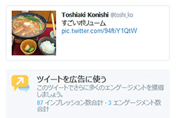 たとえば,写真やスクリーンショットと組み合わせて,「次の冬コミで新作ゲームを出します」というツイートや,「来週末に○○でイベントをやります。来てね!」というツイートを作り,それを広告にできるのだ。自分のアカウントで告知をしても,そのアカウントのフォロワーがリツイートしてくれないと,フォロワー以外の人まで大きく広がりはしないものだが,Twitter広告なら,より広い対象ユーザーに告知を届けられる可能性がある。新聞における「三行広告」的な使い方ができるTwitter広告が,セルフサービス式広告の利点といったところだろうか。