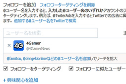 まず1つめは,「フォロワー」。ここで指定したユーザー名(アカウント)のフォロワーに対して,広告が配信されるというものだ。なにか1つのユーザー名を指定すると,そのユーザーに似たユーザー名もリストアップしてくれるので,対象にしたいユーザー名を1つ1つ入力していく手間が省ける。