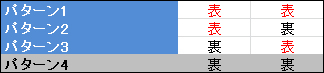 このように,全4パターンのうち,表が出ないのは裏・裏のときのみ。表が1回以上出る確率は3/4,つまり75%となる。