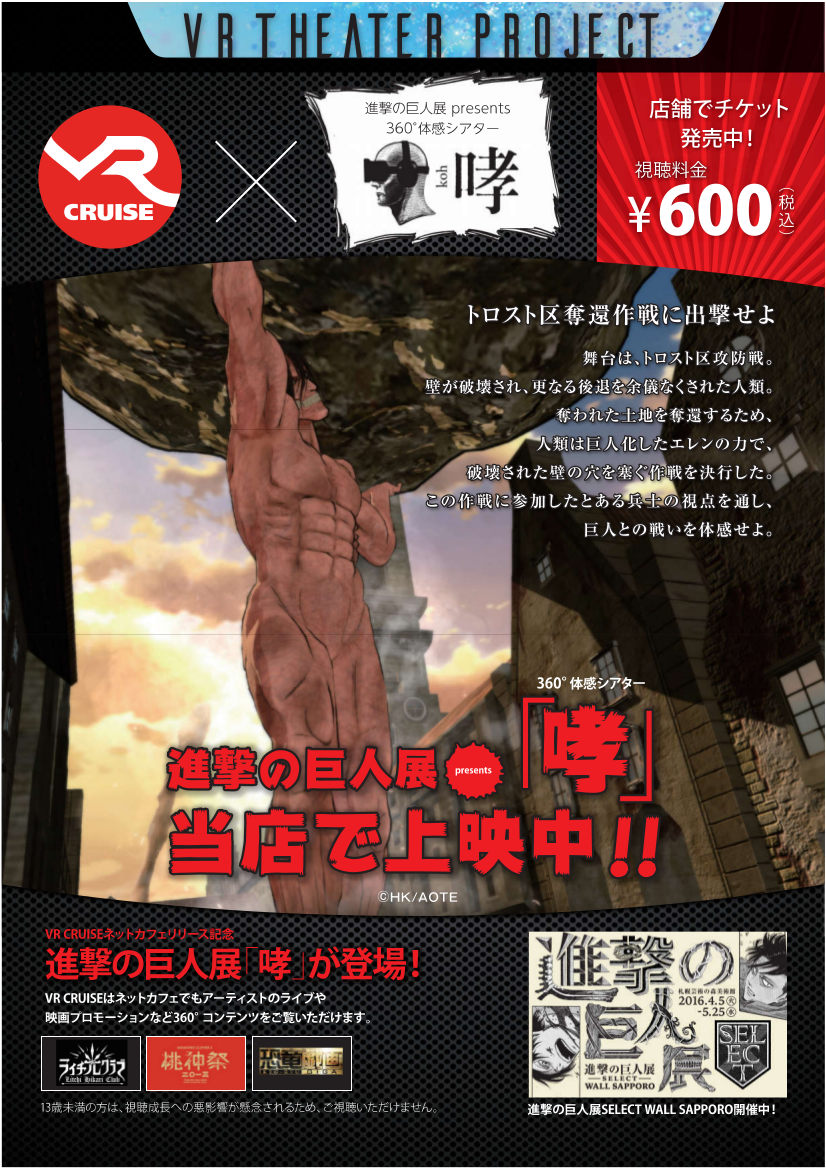 • 画像ギャラリー No.001 | ネットカフェでVRの臨場感を体験できる新サービス「VR THEATER」が,2016年4月7日にスタート。第1弾は「進撃の巨人展 360°体感シアター“哮”」に